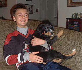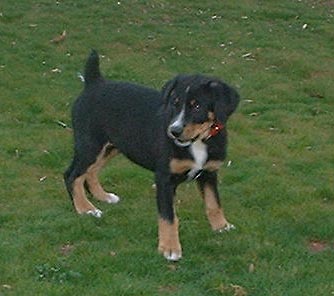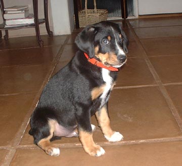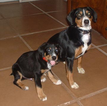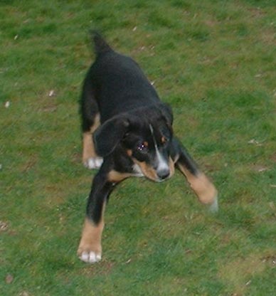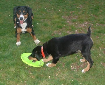 We were thrilled to welcome 8-week-old entlebucher, Bravo Victor of Wildhorn, into our home on December 3, 2002. Here are our first pictures of him, taken when he was 9 weeks old. The other entle is our Penny, who loves playing with her new buddy.